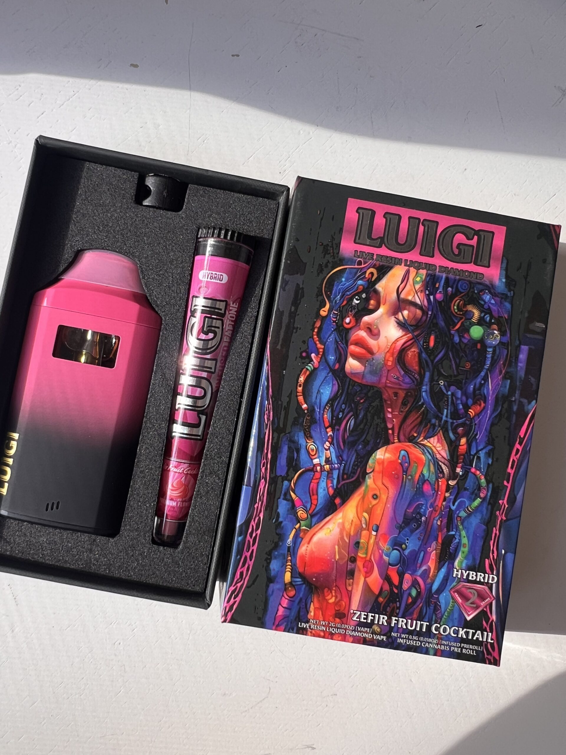 ZEFIR Fruit Cocktail Luigi Disposable Vape — 2 g live resin + liquid diamonds, Hybrid, a juicy tropical medley—pineapple, mango, papaya and a bright citrus backbone—finishing sweet and exotic; effects are uplifting, balanced, and pleasantly euphoric. Device: draw-activated, ceramic coil, USB-C rechargeable; approx. 2,000–3,000 puffs. THC: ~85%(vendor product pages report high-80s to mid-80s ranges / mg totals consistent with ~85% for listed SKU sizes). Packaged in smoke-proof, tamper-sealed sleeves and shipped in plain, reinforced mailers. Series 5 combines vibrant, tropical terpene blends with diamond-level potency so fruit-forward flavors retain impact through the shelf life.